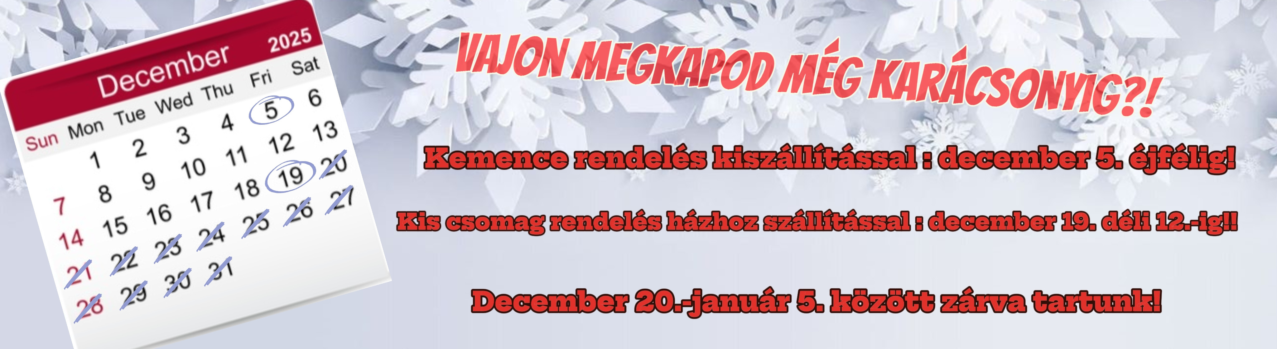 A december 5. éjfélig leadott kemence rendeléseknél tudjuk garantálni, hogy biztosan kézbesítve lesz karácsonyig! Az ezt követő kemence rend...